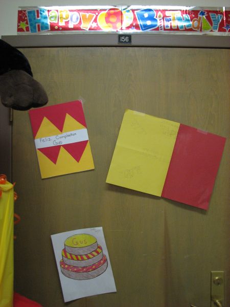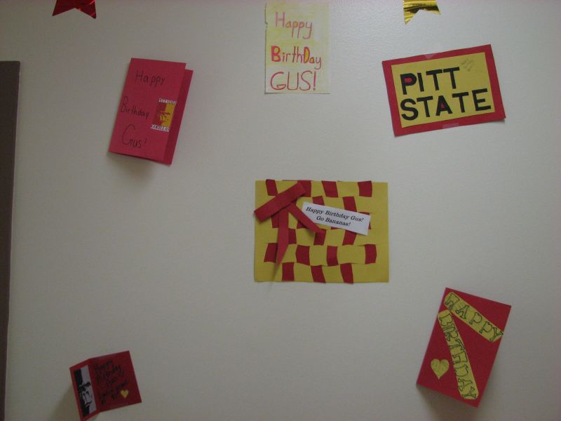 Donna Jacobs participated in the contest by decorating her office to celebrate the occasion. Her office theme was “Gus turns 90”. She asked the students that were in the Southeast Jr. High art class to send Gus birthday cards. The students replied with enthusiasm. She put them up in her office, along with a multi-layered cake with Gus the Gorilla popping out of the top.