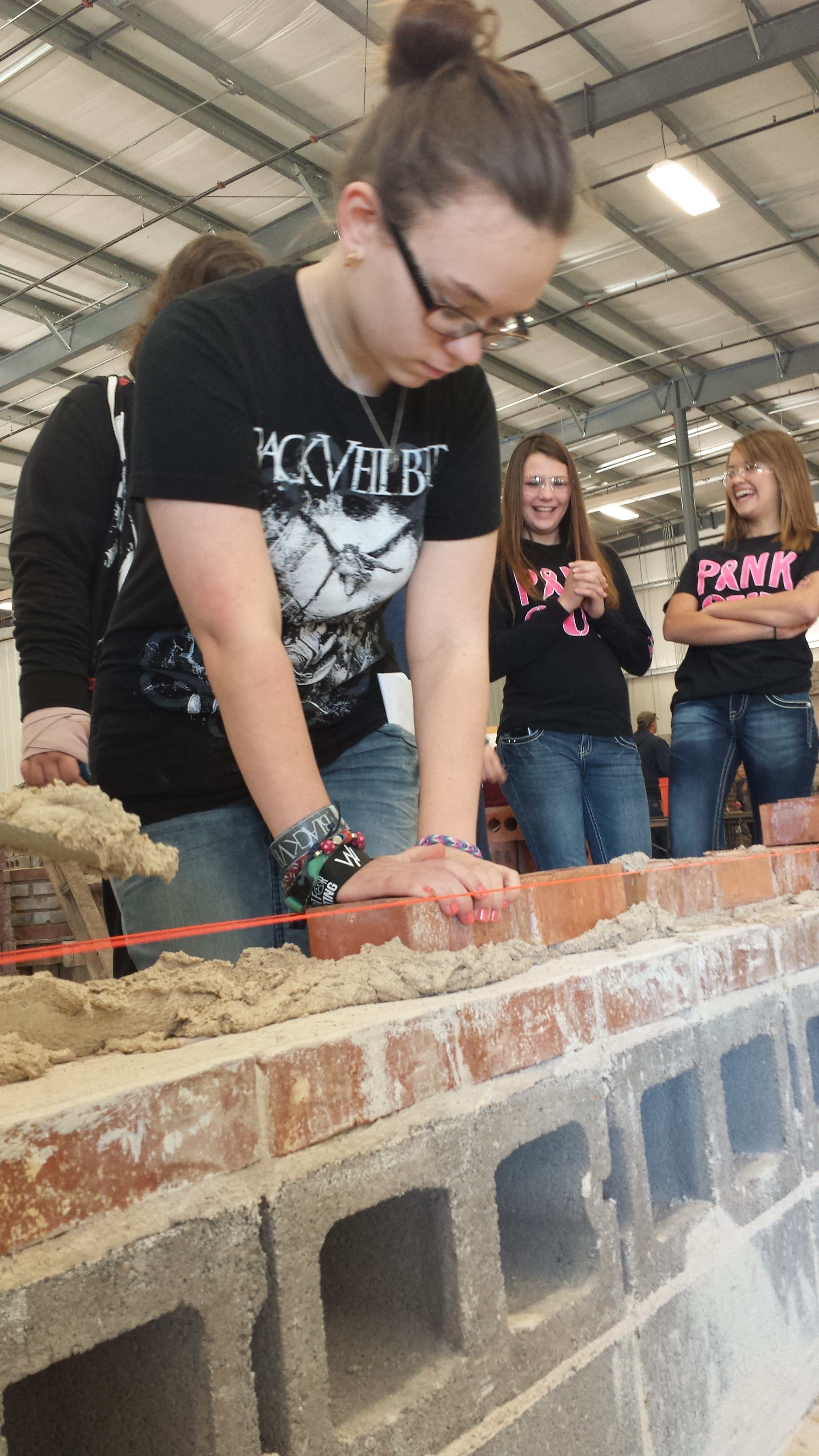 Southeast eighth grade student Maeleah Hartmann of Weir presses her brick into the mortar along a wall being built at the 6th Annual Careers in Construction Week.