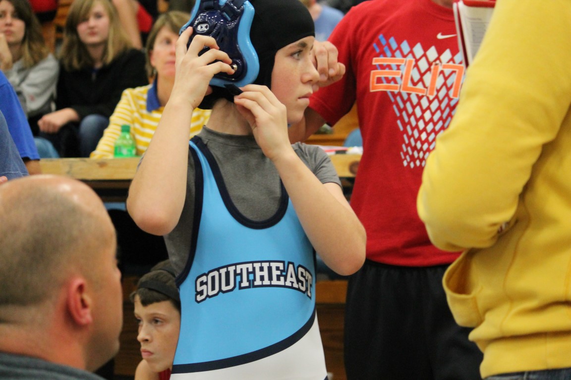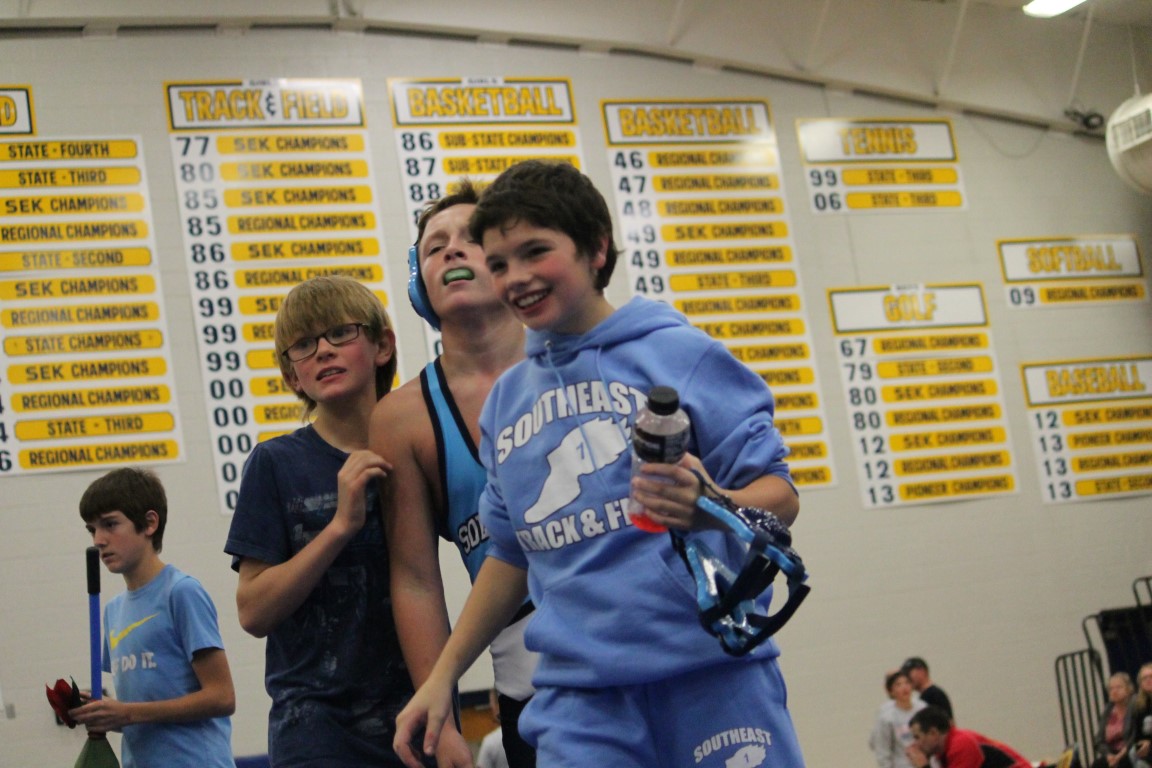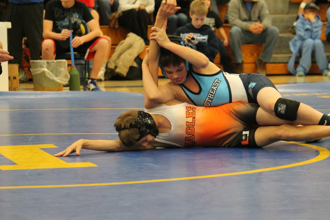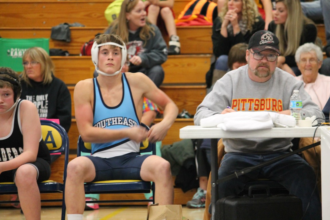 Southeast Junior High eighth grader Gage Large of Weir, Kansas became the first student-athlete to represent the Lancers in the sport of wrestling on Tuesday afternoon. With Coach Jason Wilderman watching on, in his opening match Large broke a 5-5 tie in the final period for his, and the district’s, first ever win.