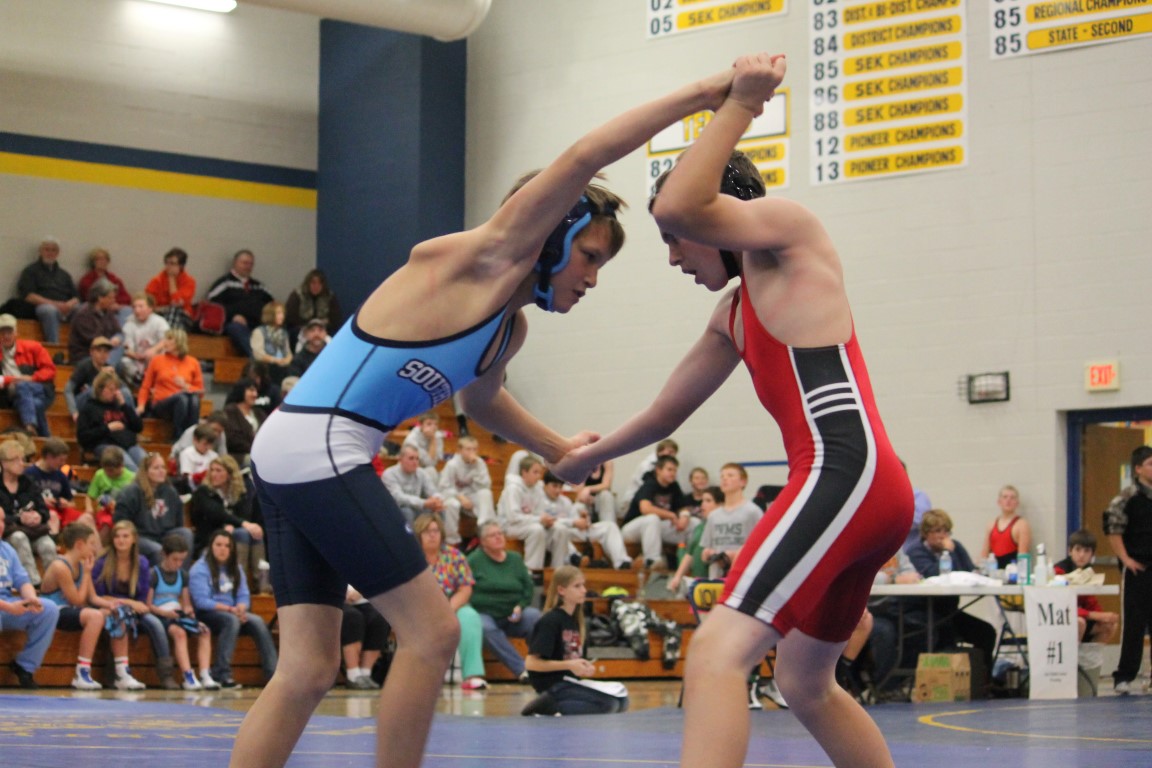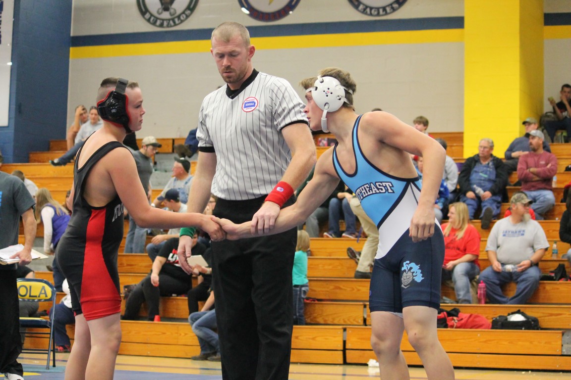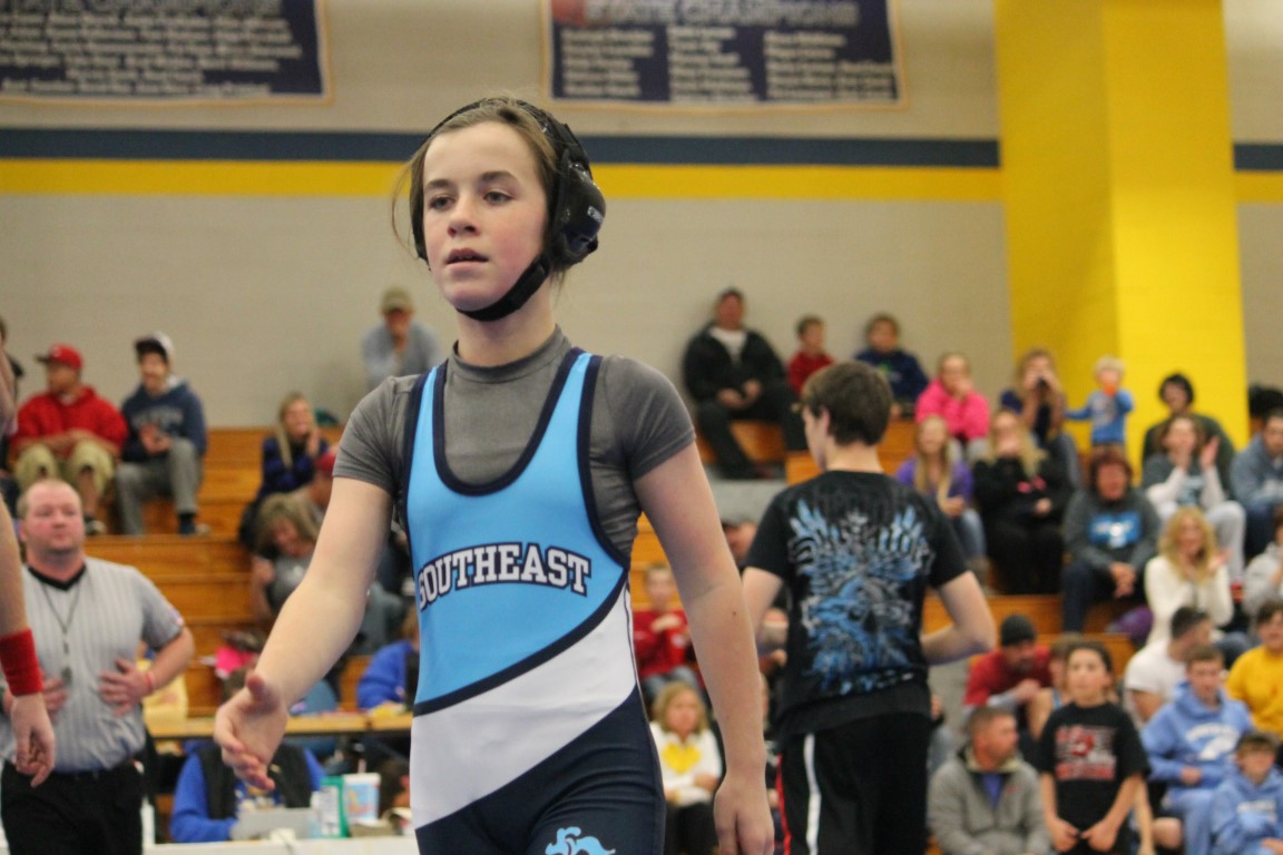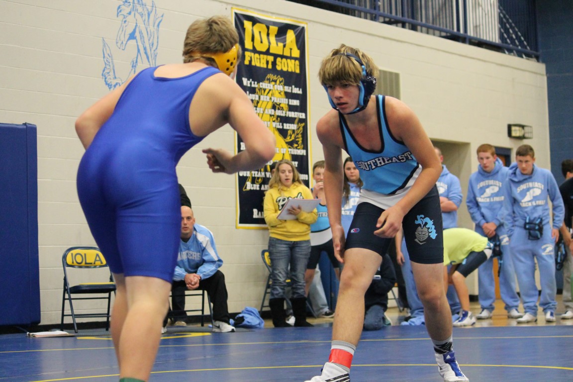 It didn’t take long for the new Southeast Junior High School to make an impression on the other schools in the school district’s first ever wrestling meet, which was held Tuesday in Iola. Eighth grader Gage Large of Weir became the first student-athlete to represent the Southeast Lancers in the sport of wrestling – and did so with a win. A short time later, seventh grader Lilly Chrysler of Scammon became the first girl to represent the Lancers in wrestling. In her opening match she pinned her opponent. By the end of the night the SJHS’s team record was an impressive 17 wins and 9 losses.