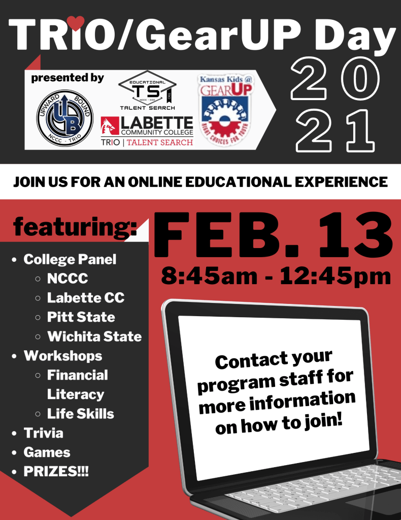 SEK TRIO Day for our Talent Search Participants will take place virtually on Feb 13th — This event is for all TRIO/Talent Search students in 6th-12th grades.
