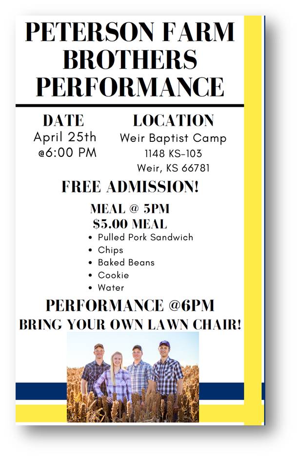This Sunday, April 25th, come out to the Weir Baptist Camp and enjoy a very entertaining, FREE performance by the Peterson Farm Brothers. Music starts at 6:00 pm. Arrive early and feast on a savory pulled pork meal with sides ($5) and support the Southeast FFA kids! Meal starts at 5:00 pm. Help spread the word by sharing, and don’t forget your lawn chairs!