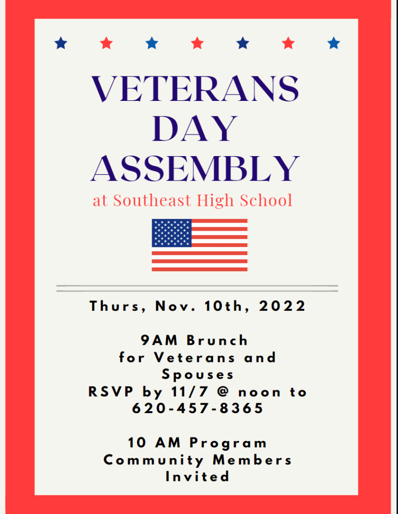SHS Veterans Day Assembly – Nov 10 Posted on October 26, 2022 by DeAnn Hamblin in News, Southeast High School (SHS) Share this Click to print (Opens in new window) Print Click to email a link to a friend (Opens in new window) Email Click to share on Facebook (Opens in new window) Facebook Click to share on Pinterest (Opens in new window) Pinterest Click to share on X (Opens in new window) X Like Loading... Related