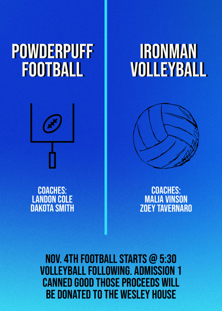 Powderpuff Football & Ironman Volleyball – Nov. 4 Posted on October 27, 2022 by DeAnn Hamblin in News, Southeast High School (SHS), Student Council CHEROKEE – Southeast High School STUCO is sponsoring a powderpuff football game and an ironman volleyball game on November 4th. See flyer for details. Share this Click to print (Opens in new window) Print Click to email a link to a friend (Opens in new window) Email Click to share on Facebook (Opens in new window) Facebook Click to share on Pinterest (Opens in new window) Pinterest Click to share on X (Opens in new window) X Like Loading... Related