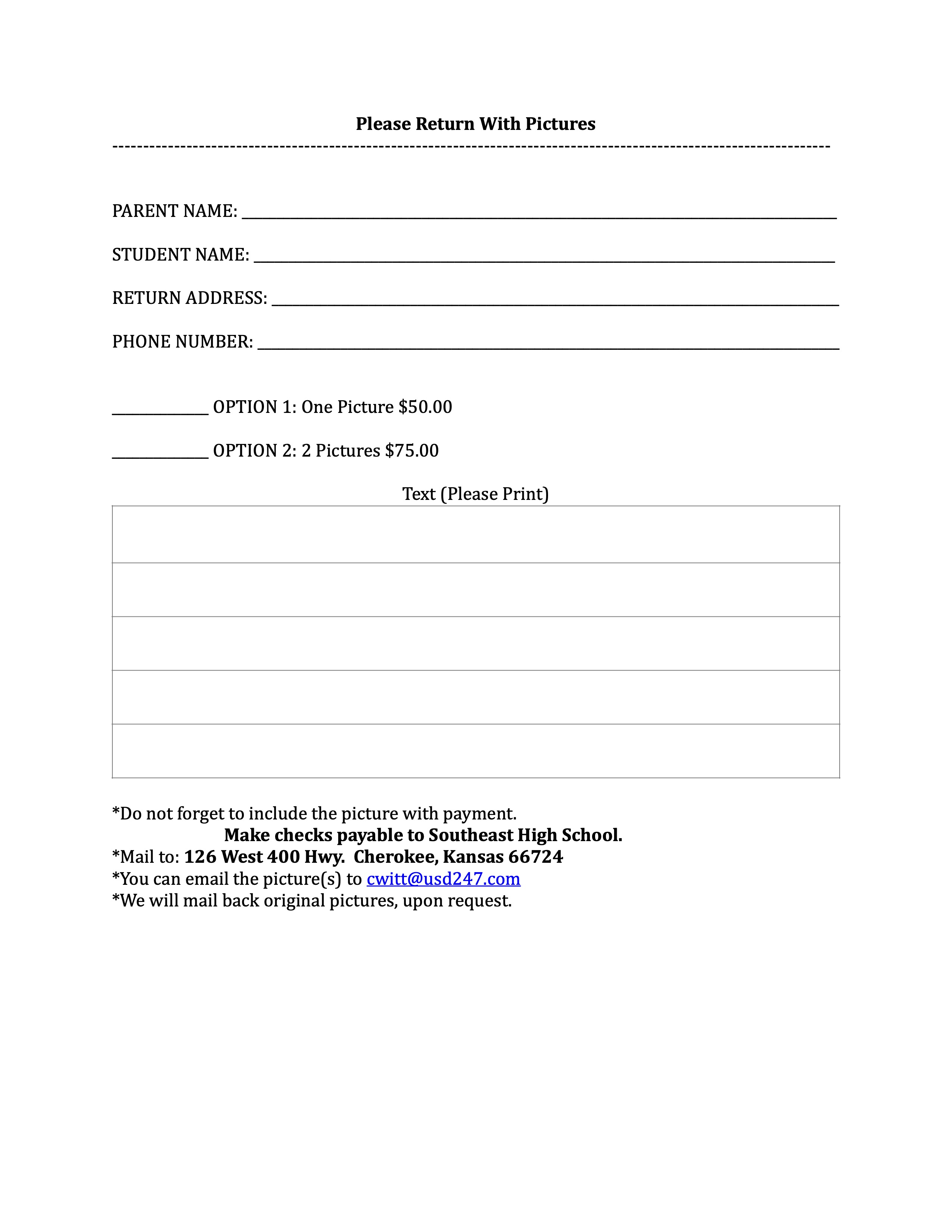 Friday, January 6th is the Deadline for Senior Pictures AND Senior Advertisements for the Yearbook. Attached is the Advertisement Option information. Otherwise, every senior needs to email or bring in a senior picture for the senior section of the yearbook. Please make sure it is a high-quality picture or something we can scan to a high-quality picture. (cwitt@usd247.com)