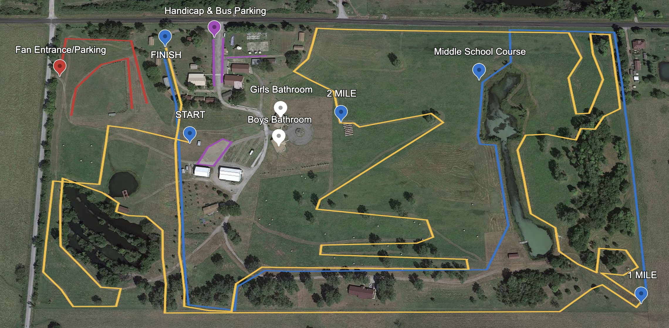 All middle school runners will start at 4pm. High school girls will begin at approximately 4:30pm followed by high school boys at approximately 5pm. Please see the map in the attachment for fan entrance and parking. **Handicap and bus parking will be at the top of the hill as outlined in purple. Fan parking will be to the west of the course outlined in red.