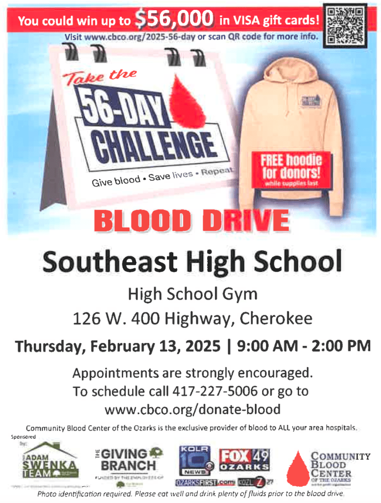 FFA Blood Drive at SHS – February 13th Posted on February 10, 2025 by Lynsey McMinn in Future Farmers of America (FFA) On Thursday, February 13th, the Southeast FFA Club will host a blood drive in the old (West) gym at the high school from 9 am – 2 pm. A light meal will be provided and each donor will receive a hoodie. Remember, each donation saves up to three lives! Share this Click to print (Opens in new window) Print Click to email a link to a friend (Opens in new window) Email Click to share on Facebook (Opens in new window) Facebook Click to share on Pinterest (Opens in new window) Pinterest Click to share on X (Opens in new window) X Like Loading... Related