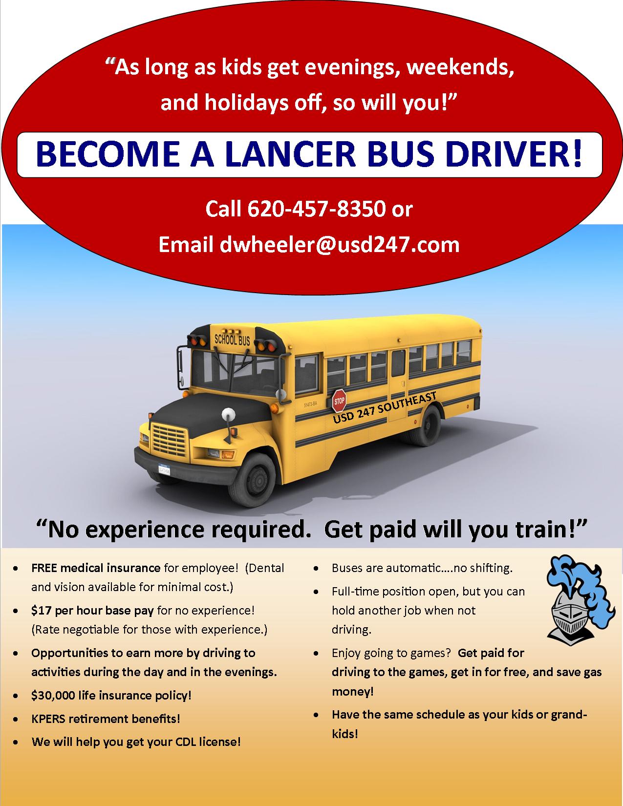 Employment Opportunity – Become a Lancer Bus Driver! Posted on August 27, 2025 by DeAnn Hamblin in Alerts, District, News Share this Click to print (Opens in new window) Print Click to email a link to a friend (Opens in new window) Email Click to share on Facebook (Opens in new window) Facebook Click to share on Pinterest (Opens in new window) Pinterest Click to share on X (Opens in new window) X Like Loading... Related #LancerSuccess#LivingTheLancerLife