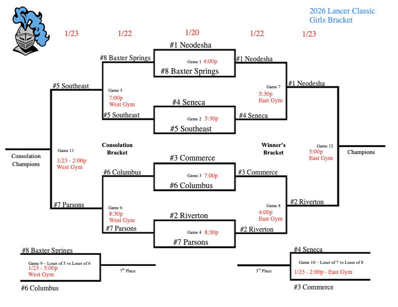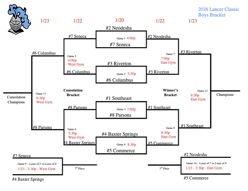 Lancer Classic Bracket Update – 1/23/26 Posted on January 23, 2026 by Lynsey McMinn in Alerts, Basketball, Southeast High School (SHS) Games start at 2pm today, 1/23! Please see attached brackets for more information. Share this Print (Opens in new window) Print Email a link to a friend (Opens in new window) Email Share on Facebook (Opens in new window) Facebook Share on Pinterest (Opens in new window) Pinterest Share on X (Opens in new window) X Like Loading... Related Basketball News Lancer Classic Bracket Update – 1/23/26 Lancer Classic 1/22/26 UPDATE Lancer Classic Schedule Change SHS Winter Sports Pictures – 1/14 SHS Basketball vs Erie – 1/13 SMS Basketball Game Change – Nov 17 Coaching Opportunity at Southeast Middle School (Position Filled)